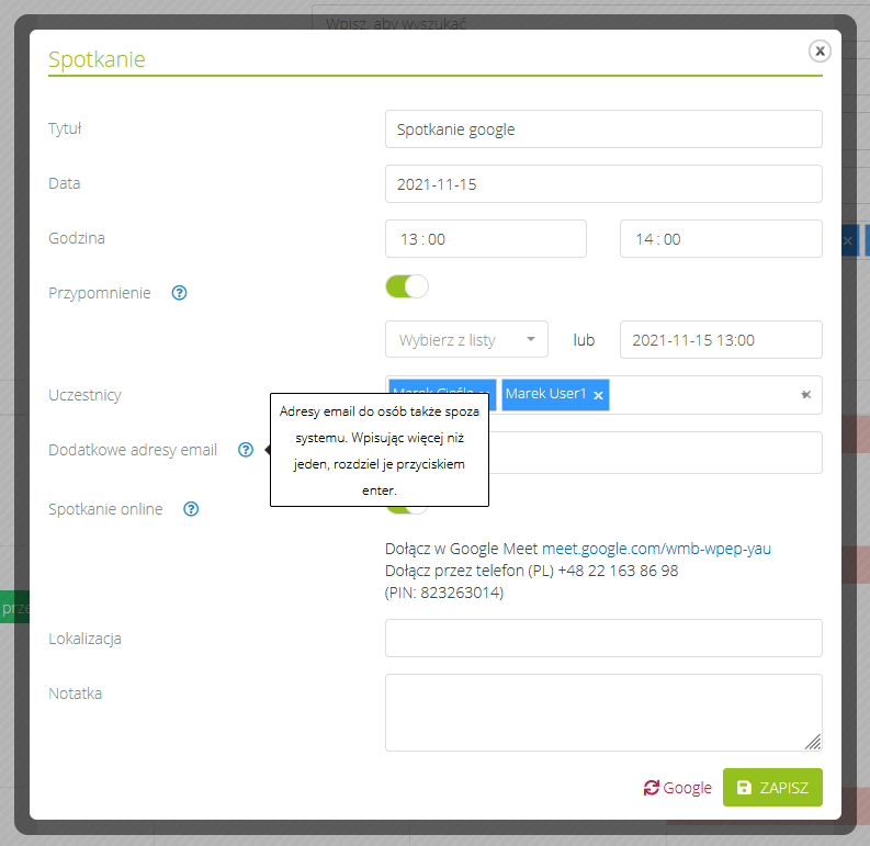 - Jeżeli spotkanie odbywa się online, należy zaznaczyć taką opcję podczas dodawania spotkania. W przypadku integracji z Google link do spotkania w Google Meet zostanie automatycznie wygenerowany. W innym wypadku dostępna będzie opcja samodzielnego wstawienia linku do spotkania.