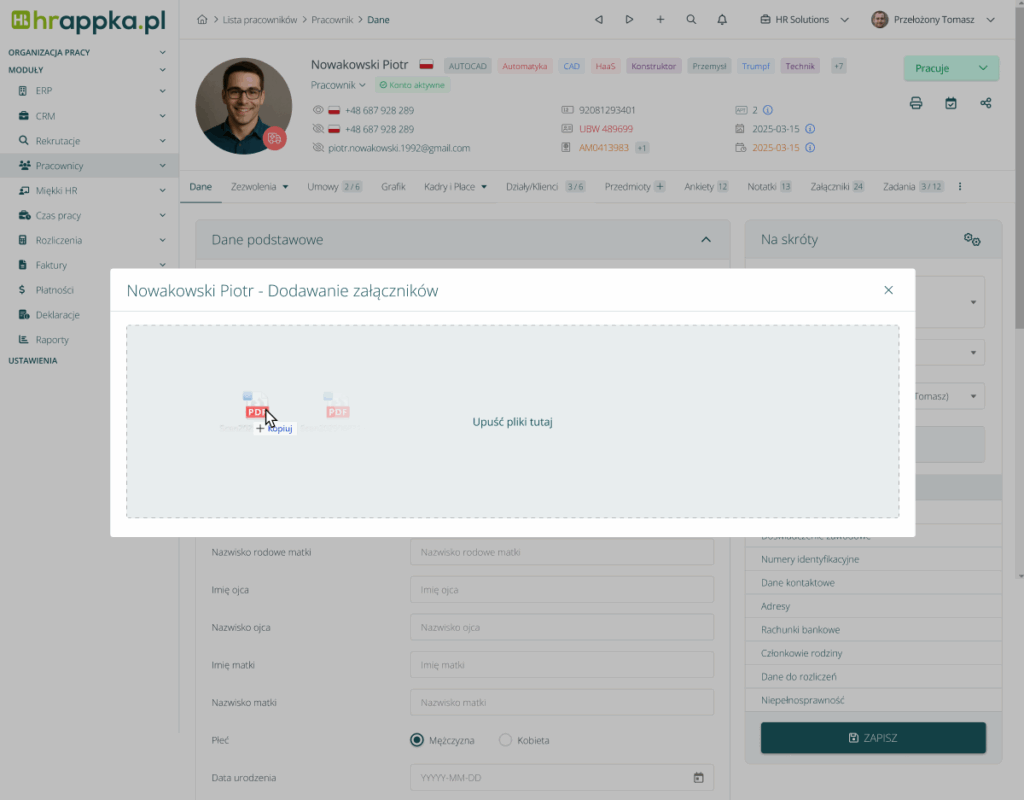 Załączniki można przeciągnąć na profil pracownika bez konieczności wchodzenia w zakładkę Załączniki.