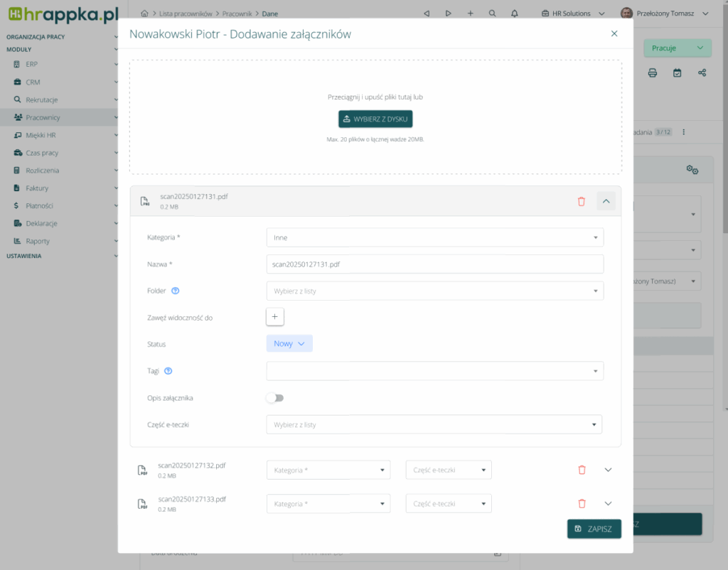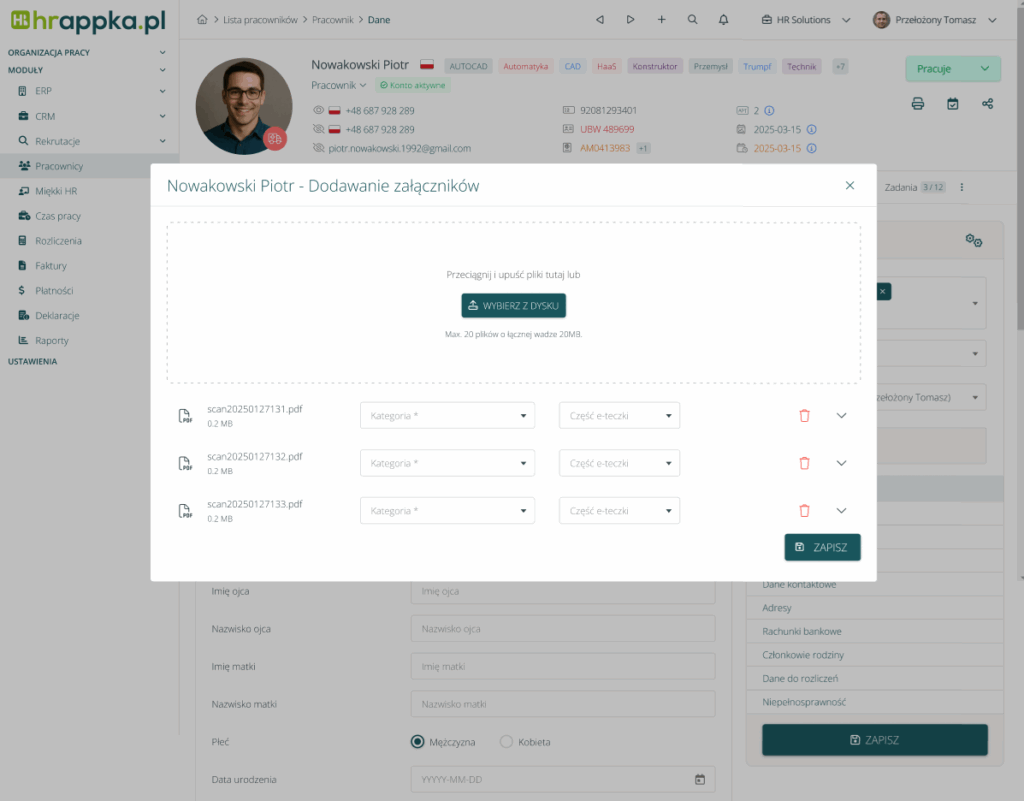 Dodaliśmy możliwość dodawania załączników bezpośrednio z poziomu profilu pracownika – zarówno pojedynczo, jak i masowo.