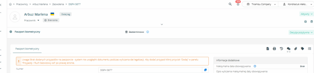 Na liście zezwoleń pole Notatka zostało zmienione na Dodatkowa informacja . Dodaliśmy kolumnę o tej samej nazwie, w której prezentowane są dane wprowadzone w tym polu. Dzięki temu można je szybko podejrzeć już z poziomu listy zezwoleń.