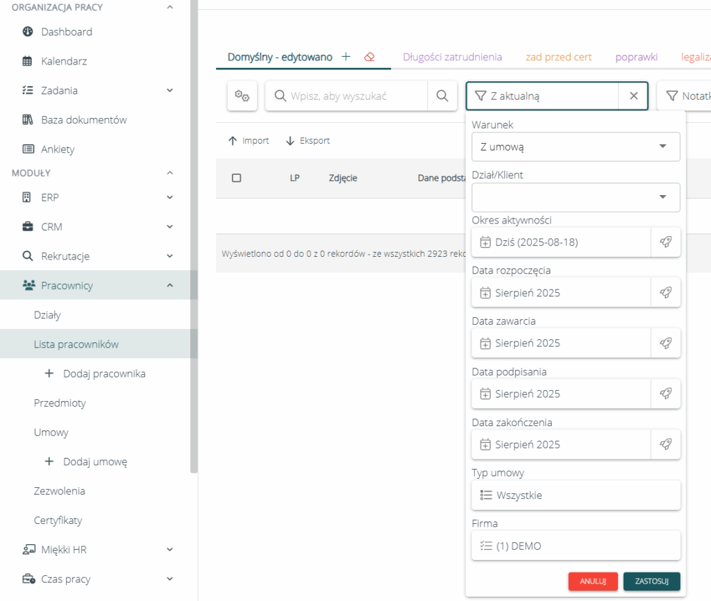 Na nowej liście pracowników został rozbudowany filtr Umowa, który pozwala na filtrowanie w sposób tożsamy z wcześniejszą listą. Dzięki temu można wyszukiwać m.in.: