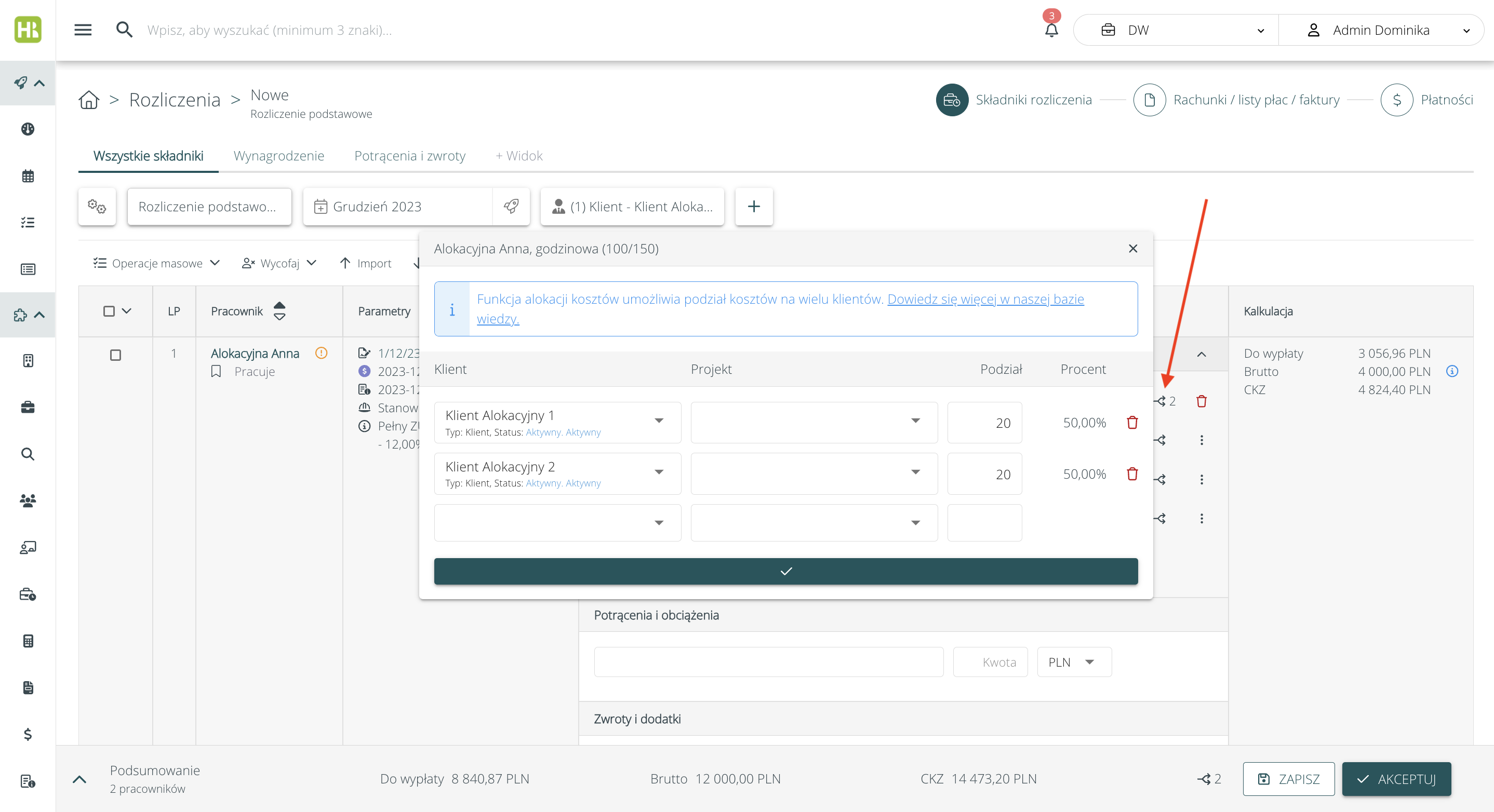Podczas naliczania wynagrodzeń koszty można odpowiednio rozdzielać na Klientów / projekty. Na pierwszym kroku rozliczenia system pozwoli rozdzielić każdy składnik wynagrodzenia pracownika na Klientów / projektów.