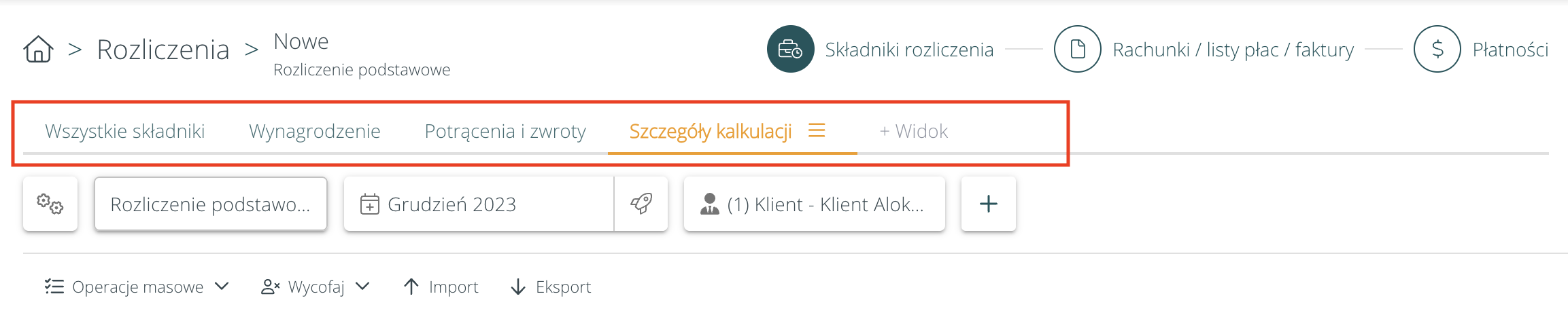 Umożliwiliśmy dodawanie własnych widoków na pierwszym kroku rozliczenia pracowników. Umożliwia to zapisanie własnego ustawienia kolumn do możliwych do udostępniania widoków. Filtry nie są uwzględniane w widokach.Po odświeżeniu strony nadal pozostaniemy na nowym widoku. Utworzony widok możemy wykorzystać na innych rozliczeniach.