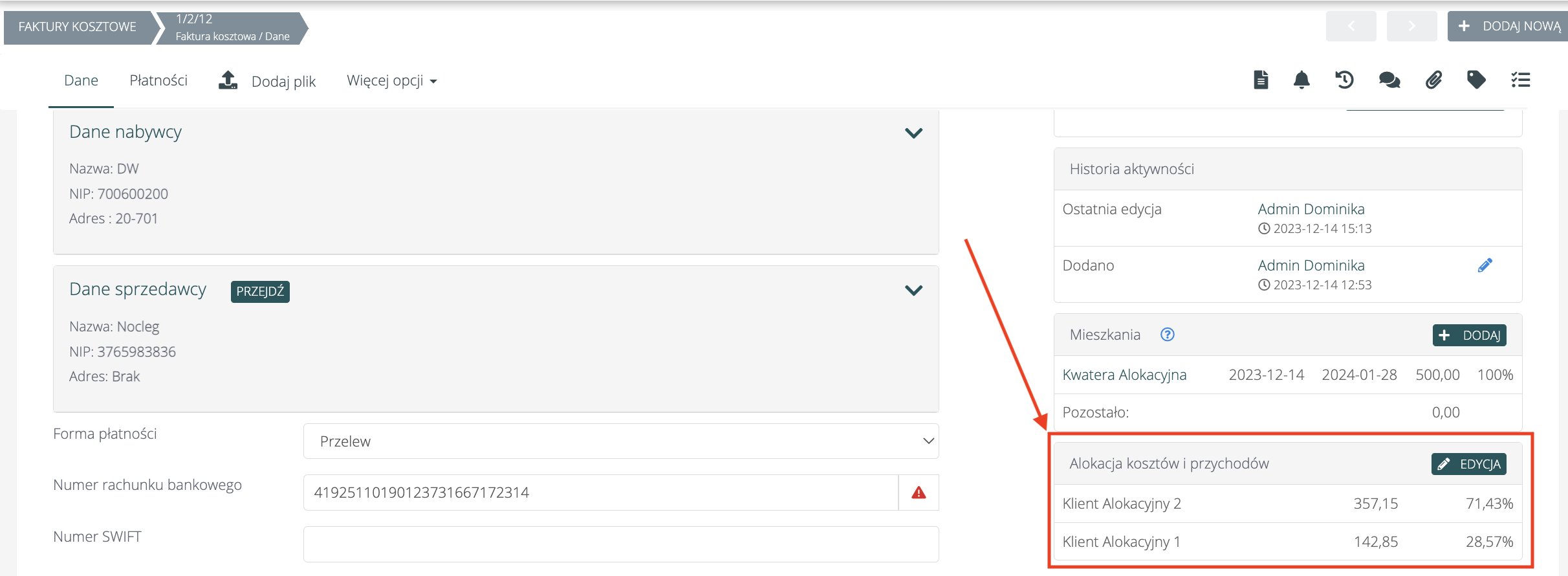 Szczegóły alokacji dostępne są na profilu faktury, w sekcji „Alokacja kosztów i przychodów” (sekcja po prawej stronie):