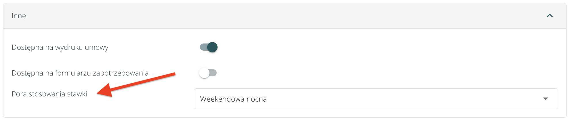 W Ustawienia > Dane firmy > Stawki > Typy stawek > Edycja stawki w polu „Pora stosowania stawki” dostępne są nowe opcje: