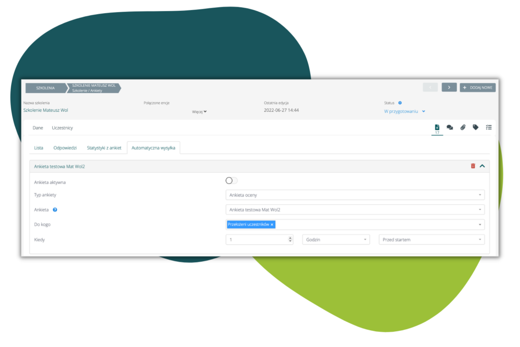 - Automatyczna wysyłka – ankiety są automatycznie wysyłane przez system i mamy możliwość wybrania: