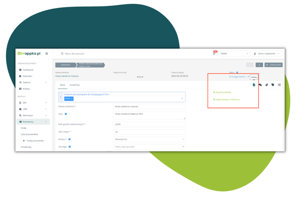 W Pracownicy > Lista szkoleń > Wybrane szkolenie, można teraz wejść w listę ankiet, wypełnić ankietę lub wysłać ankietę o szkoleniu: