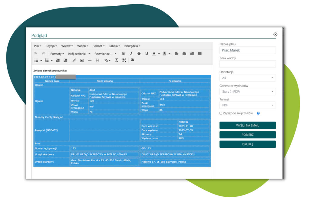 W Ustawienia firmy > Szablony > Wydruki, dodany został nowy znacznik {%Ostatnia zmiana danych%}. Znajduje się on w zakładce „Pracownik – dane podstawowe. Znacznik wykazuje datę i osobę, która ostatnio edytowała dane pracownika wraz z tabelką zmian.