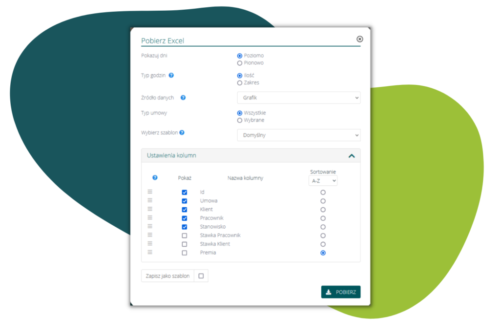 W Rozliczenia > Rozliczenia > Pobierz Excel, checkbox „Premia” przeniesiony został do Ustawienia kolumn. Dodana została również możliwość konfiguracji kolumn, które powinny być widoczne w raporcie w pliku Excel. Dodatkowo Ustawienie kolumn zapisać można jako szablon, na podstawie którego tworzone będą następne raporty.