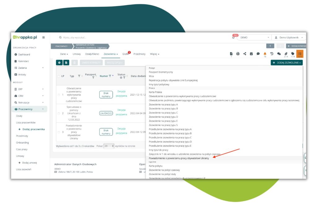 Dodano również możliwość stosowania Powiadomienia o powierzeniu wykonywania pracy obywatelowi Ukrainy, w przypadku posiadania Decyzji abolicyjnej (do tej pory możliwe było to tylko przy pomocy Oświadczenia dotyczącego powierzenia pracy cudzoziemcowi – ta opcja nadal jest dostępna). W tym przypadku na dashboardzie legalizacji, komunikat „Wygaśnięcie decyzji abolicyjnej – Brak wysłanego oświadczenia” zniknie, gdy dodamy oświadczenie ( tak jak do tej pory ) lub po dodaniu Powiadomienia o powierzeniu pracy obywatelowi Ukrainy:
