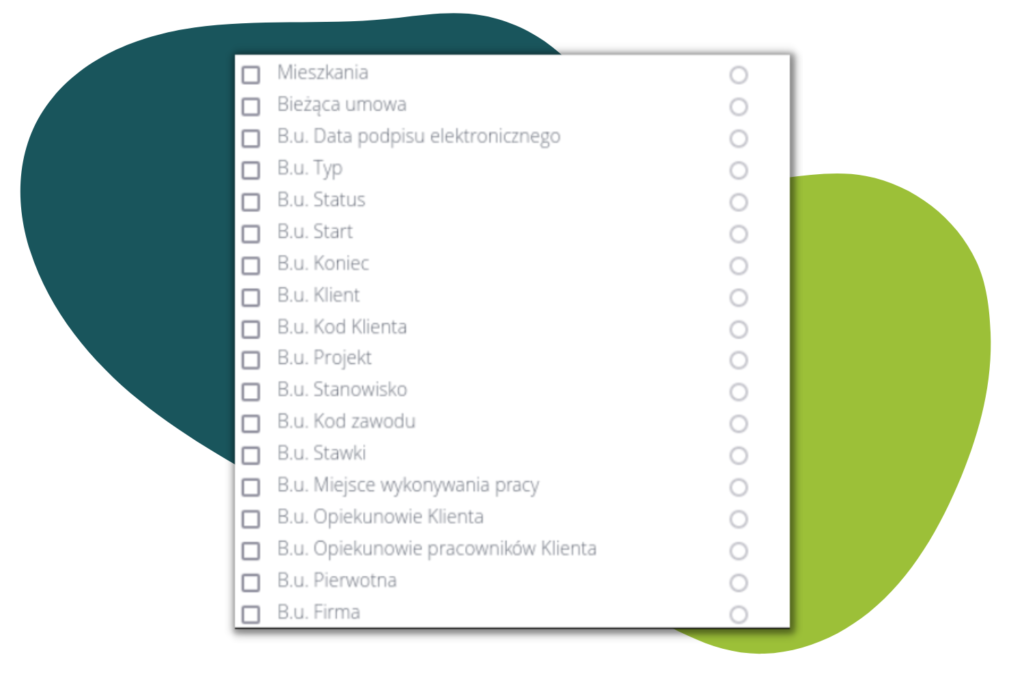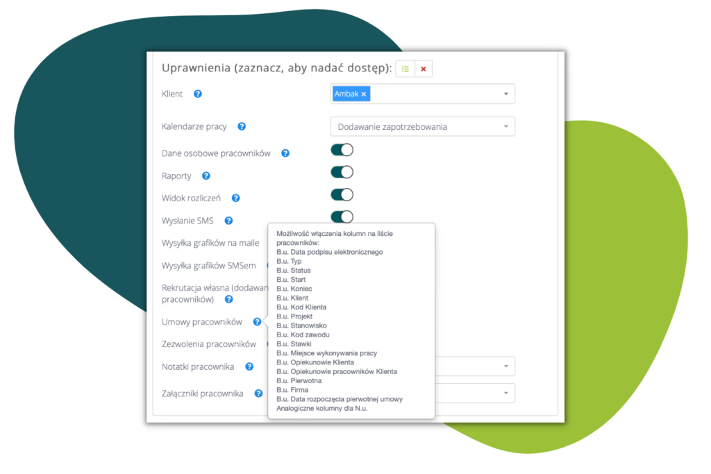 Po włączeniu w Ustawienia firmy >Użytkownicy > Użytkownicy > Dane konto, opcji „Umowy pracowników”, użytkownicy o roli Klient, będą mogli włączyć na liście pracowników nowe kolumny: