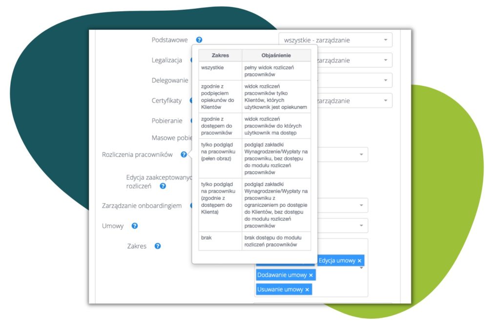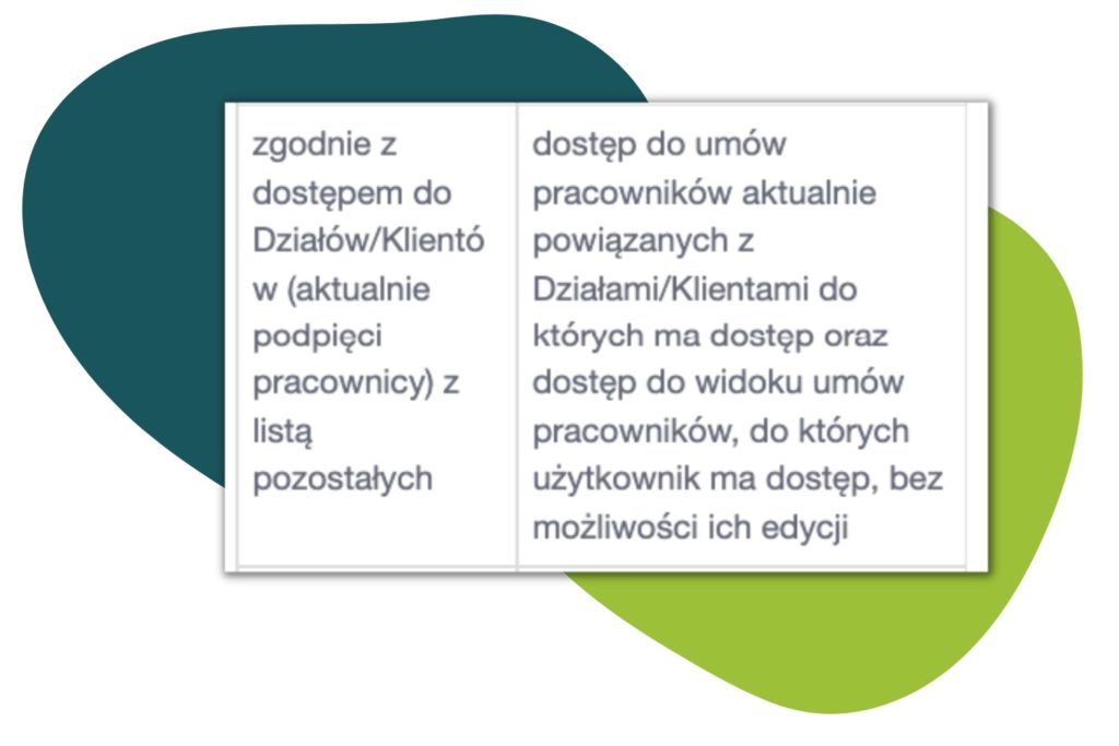 W Ustawienia firmy > Użytkownicy > Użytkownicy > Dany użytkownik > Umowy, dodane zostało nowe uprawnienie „Zgodnie z dostępem do Działów/Klientów (aktualnie podpięci pracownicy) z listą pozostałych: