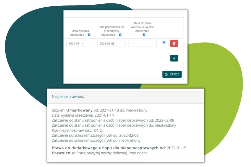 W Pracownicy > Lista pracowników > Dany pracownik lub Dodaj pracownika, po zaznaczeniu opcji „Niepełnosprawność”, pojawia się okno, w którym dodane zostały pola: