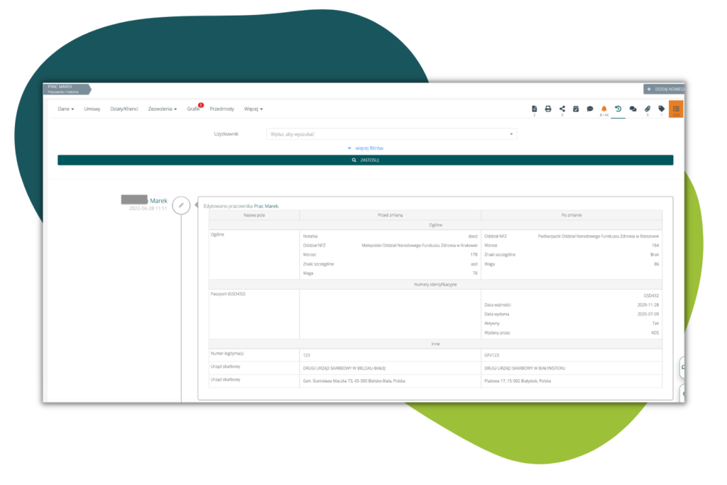 W Pracownicy > Lista pracowników > Dany pracownik> widoczna jest historia zmian w danych pracownika,