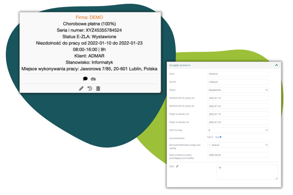 W Pracownicy> Dany pracownik > Grafik, w przypadku zwolnień chorobowych i zasiłków pojawia się okno ze szczegółami zwolnienia lekarskiego (po kliknięciu w edytuj nieobceność). Dane domyślnie pobierane są z PUE, ale jest możliwość wprowadzenia ich ręcznie.