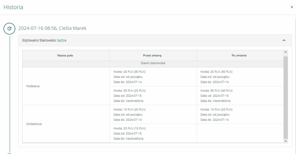 - Jeżeli dodana zostanie nowa stawka pole „Przed zmianą” pozostanie puste a „Po zmianie” uzupełnione danymi dotyczącymi nowej stawki