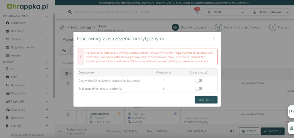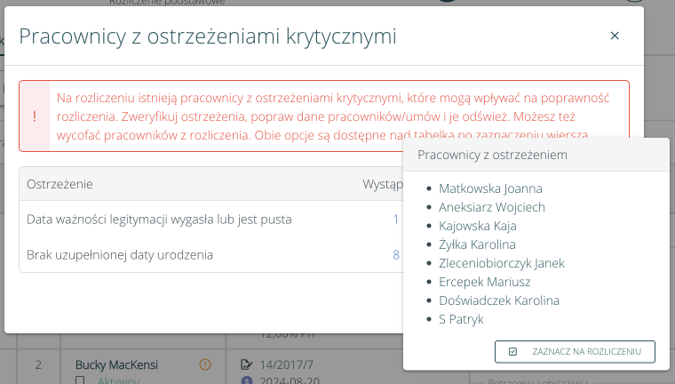 • Ostrzeżenia krytyczne na rozliczeniu pracownika