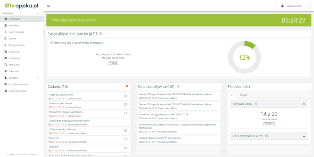 Aby ułatwić dostęp do informacji na temat ilości przepracowanego czasu na dashboardzie dodaliśmy nowy widget informujący o trwającej rejestracji czasu pracy.