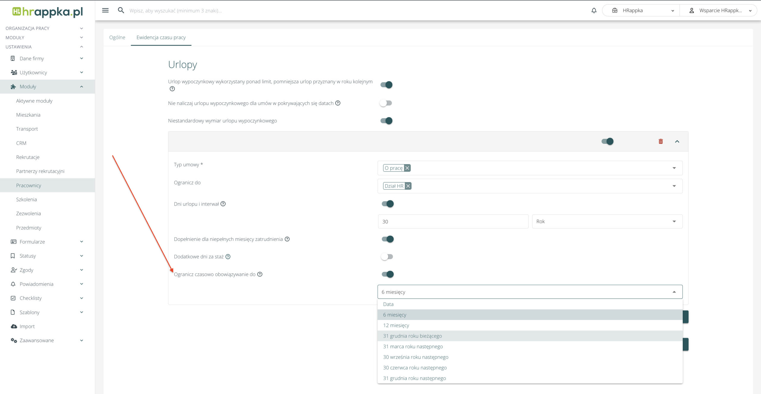 Włączenie opcji i zdefiniowanie daty obowiązywania spowoduje, że przyznany urlop może zostać wykorzystany tylko przed upływem określonej daty.