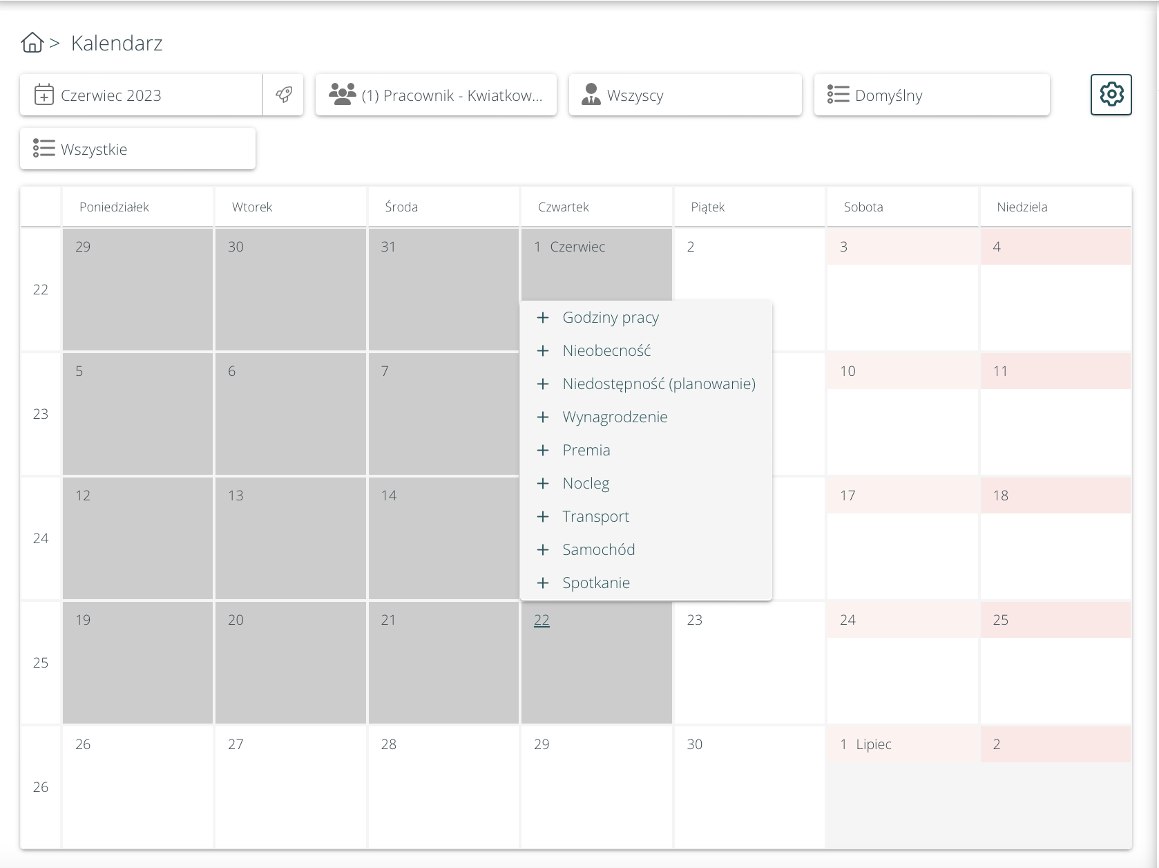 • W Czas pracy > Zgłoszenia pracowników oraz Czas pracy > Ewidencja czasu pracy dodano: