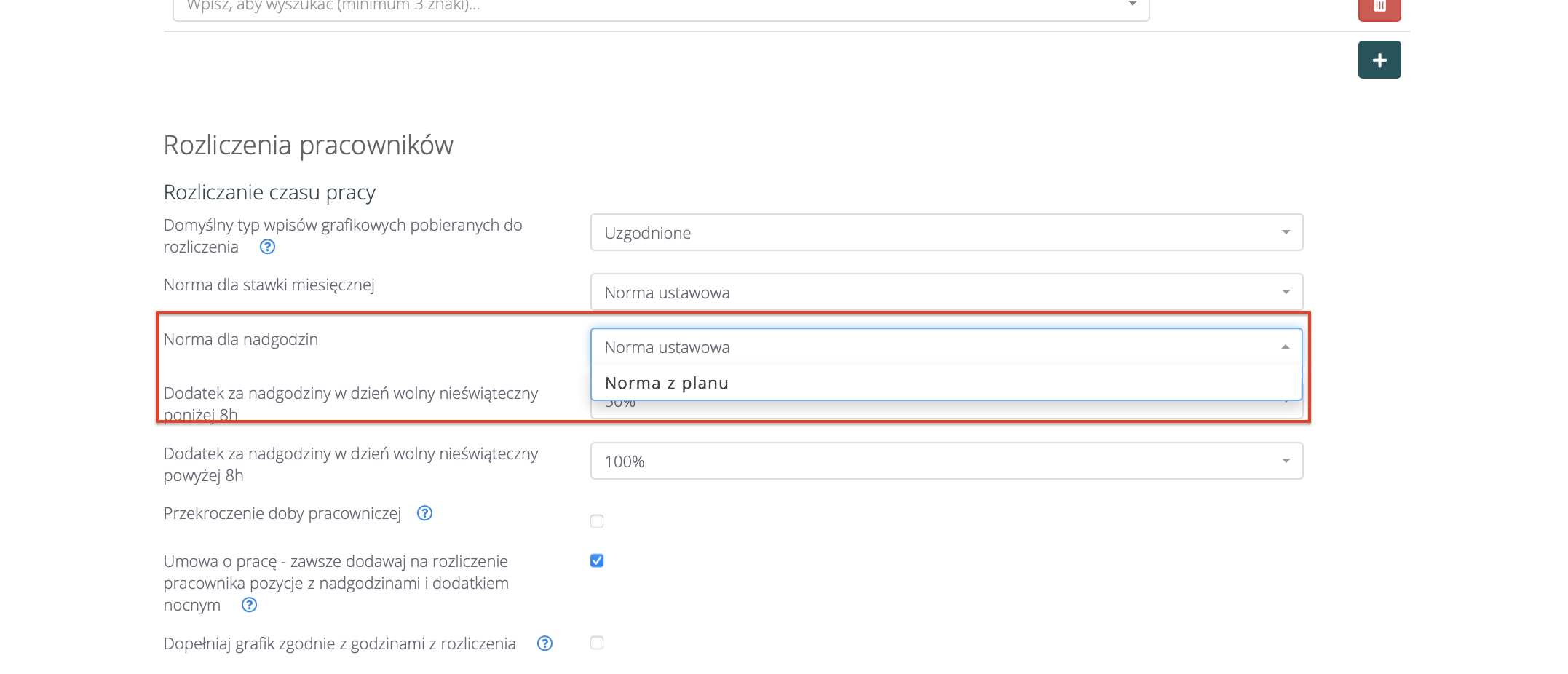 • W Ustawienia > Moduły > Pracownicy > Rozliczenia pracowników w polu „Norma dla nadgodzin” dodane zostały opcje „Norma ustawowa” oraz „Norma z planu”.
