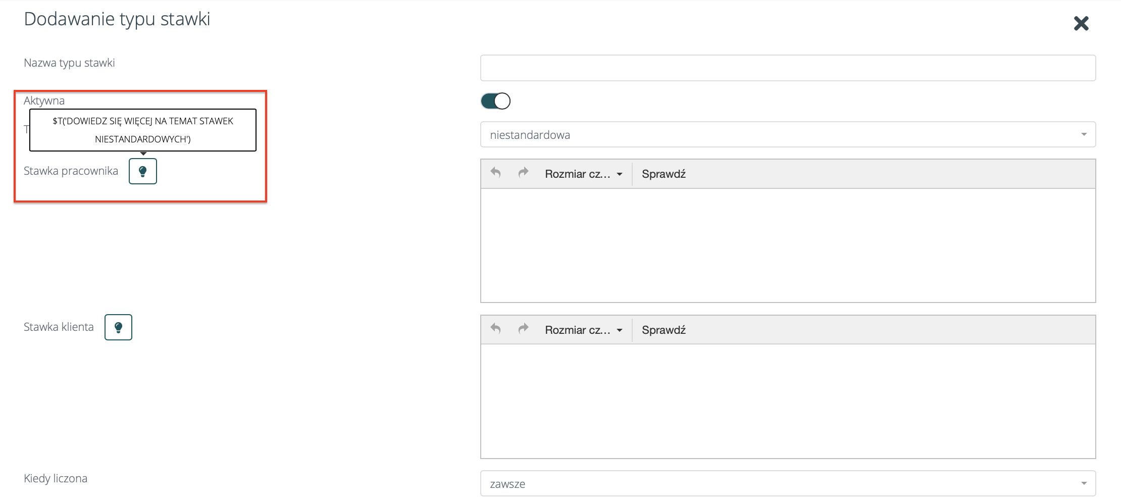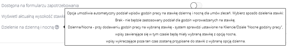 • W Ustawienia > Dane firmy > Stawki > Typy stawek, podczas dodawania lub edycji stawki, w sekcji „Inne” została dodana nowa opcja „Dzielenie na dzienną i nocną”. Informacje o sposobie działania opcji zawarte są w tooltpie.