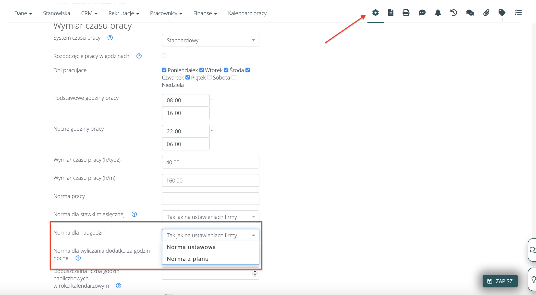 Analogicznie dodano ustawienie w CRM > Klienci > Dany klient > Ustawienia > Norma dla nadgodzin („Tak jak na ustawieniach firmy”; „Norma ustawowa”; „Norma z planu”).