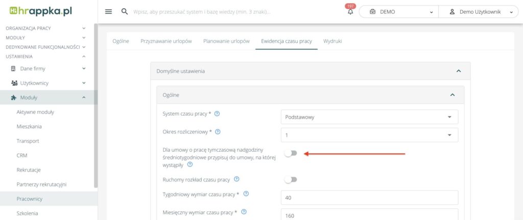 Wprowadzamy ustawienie “Dla umowy o pracę tymczasową nadgodziny średniotygodniowe przypisuj do umowy, na której wystąpiły”. Dotyczy ono rozliczania kilku umów o pracę tymczasową w jednomiesięcznym okresie rozliczeniowym. Będzie można je znaleźć w Ustawieniach > Moduły > Pracownicy > Ewidencja czasu pracy: