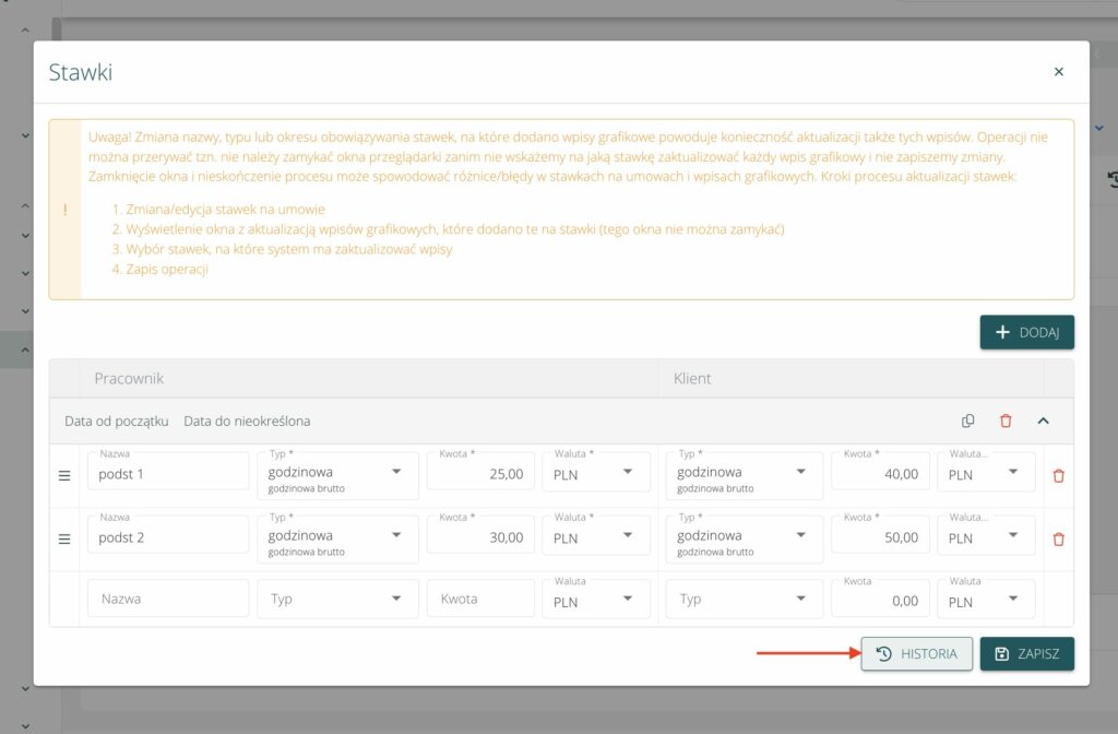 • Historia edycji stawek pracownika