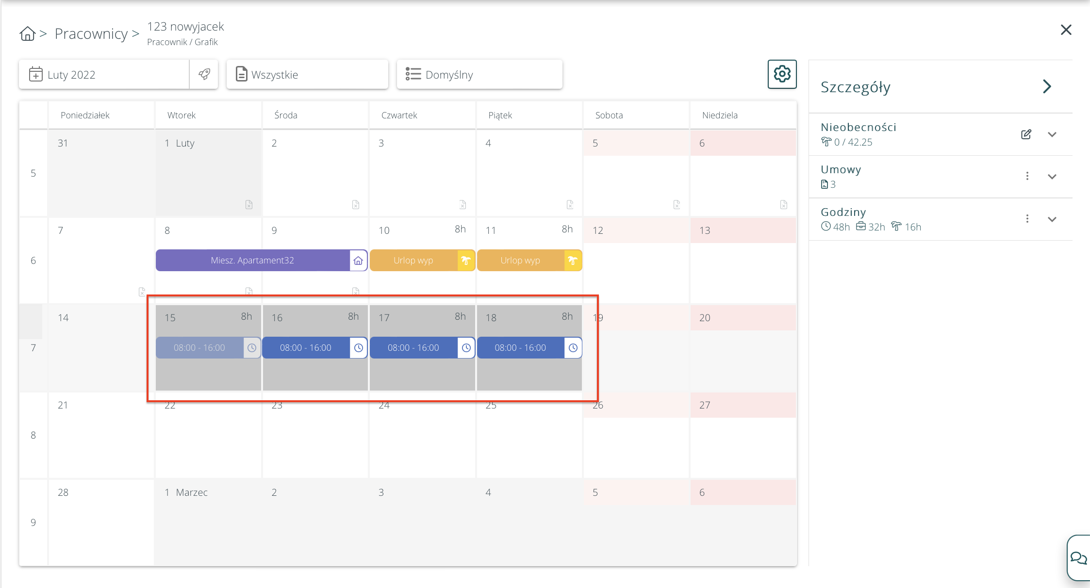 Na kalendarzach pracy oraz na grafiku pracownika dodana została możliwość kopiowania wpisów grafikowych (np. godzin pracy), za pomocą przeciągania. Należy kliknąć na dany wpis, pojawi się wtedy zakładka w prawym dolnym rogu, należy ją przytrzymać i przeciągnąć wpis na wybrane dni: