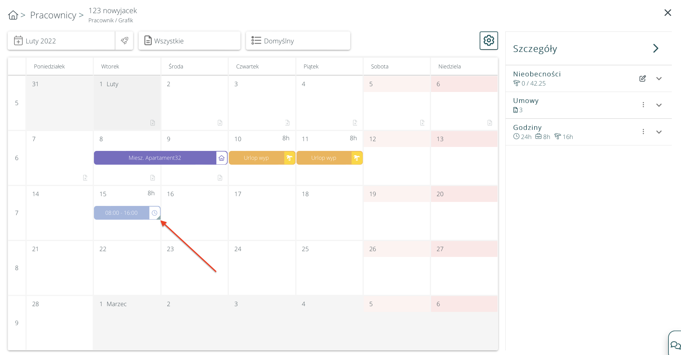 Na kalendarzach pracy oraz na grafiku pracownika dodana została możliwość kopiowania wpisów grafikowych (np. godzin pracy), za pomocą przeciągania. Należy kliknąć na dany wpis, pojawi się wtedy zakładka w prawym dolnym rogu, należy ją przytrzymać i przeciągnąć wpis na wybrane dni: