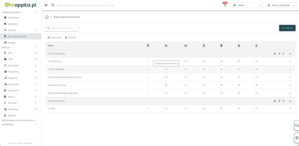 Administratorzy będą mieli możliwość edycji bazy poprzez dodawanie folderów i plików, zmianę nazwy, a także zawężania widoczności dla wybranych firm, działów / Klientów, grup, ról, tagów czy też typu umowy. Aby to zrobić należy wybrać filtry poprzez kliknięcie ikony plusa w polu „Widoczne dla”. Podczas dodawania administratorzy zdecydują również o możliwości pobierania pliku przez pracowników.