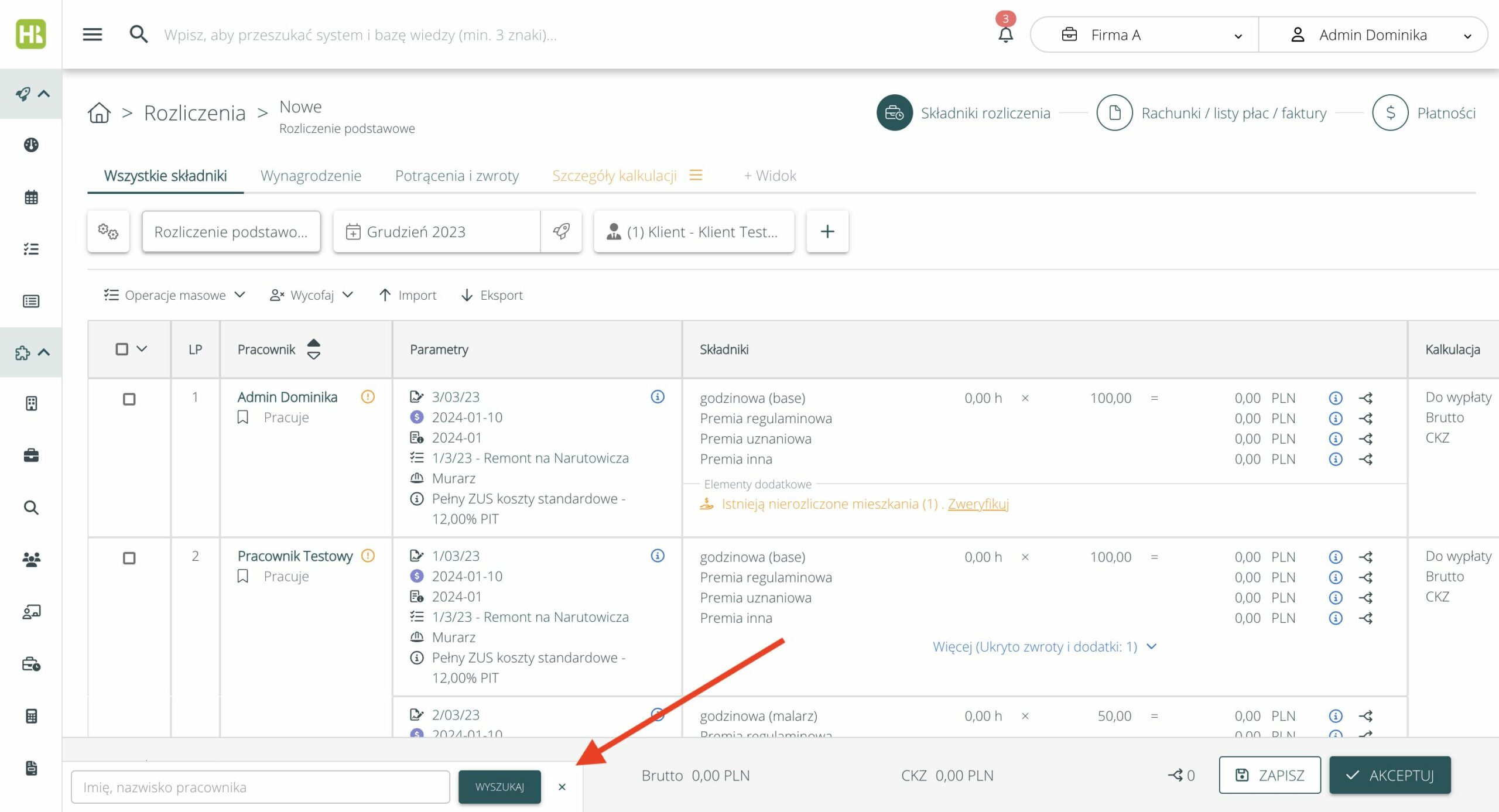 Na rozliczeniu pracowników, po kliknięciu CTRL + F w systemie Windows lub control (^) + F w systemie MacOS, w lewym dolnym rogu pojawi się wyszukiwarka systemowa, która pozwoli przeszukać rozliczenie po imieniu i nazwisku pracownika. Nowa wyszukiwarka działa dokładniej niż wyszukiwarka przeglądarkowa, ponieważ uwzględnia również elementy ładujące się w tle podczas scrollowania, których wyszukiwarka przeglądarkowa nie uwzględni.