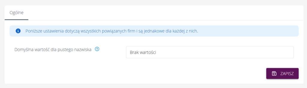 W celu usprawnienia procesu przygotowywania dokumentacji do urzędów dla pracowników nie posiadających nazwiska, w systemie została dodana opcja „Domyślna wartość dla pustego nazwiska”. Podczas generowania, np. deklaracji ZUS/PIT, system automatycznie uzupełni brakujące nazwisko wartością wprowadzoną w tym polu.