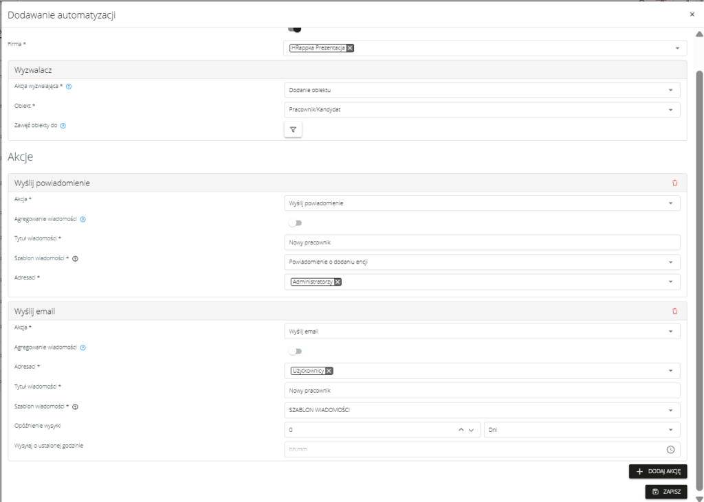 Obecnie w ramach jednej automatyzacji istnieje możliwość zdefiniowania wielu akcji (np. wysyłka powiadomienia oraz wysyłka e-mail), co pozwala na kompleksową obsługę procesów bez konieczności tworzenia wielu osobnych automatyzacji.