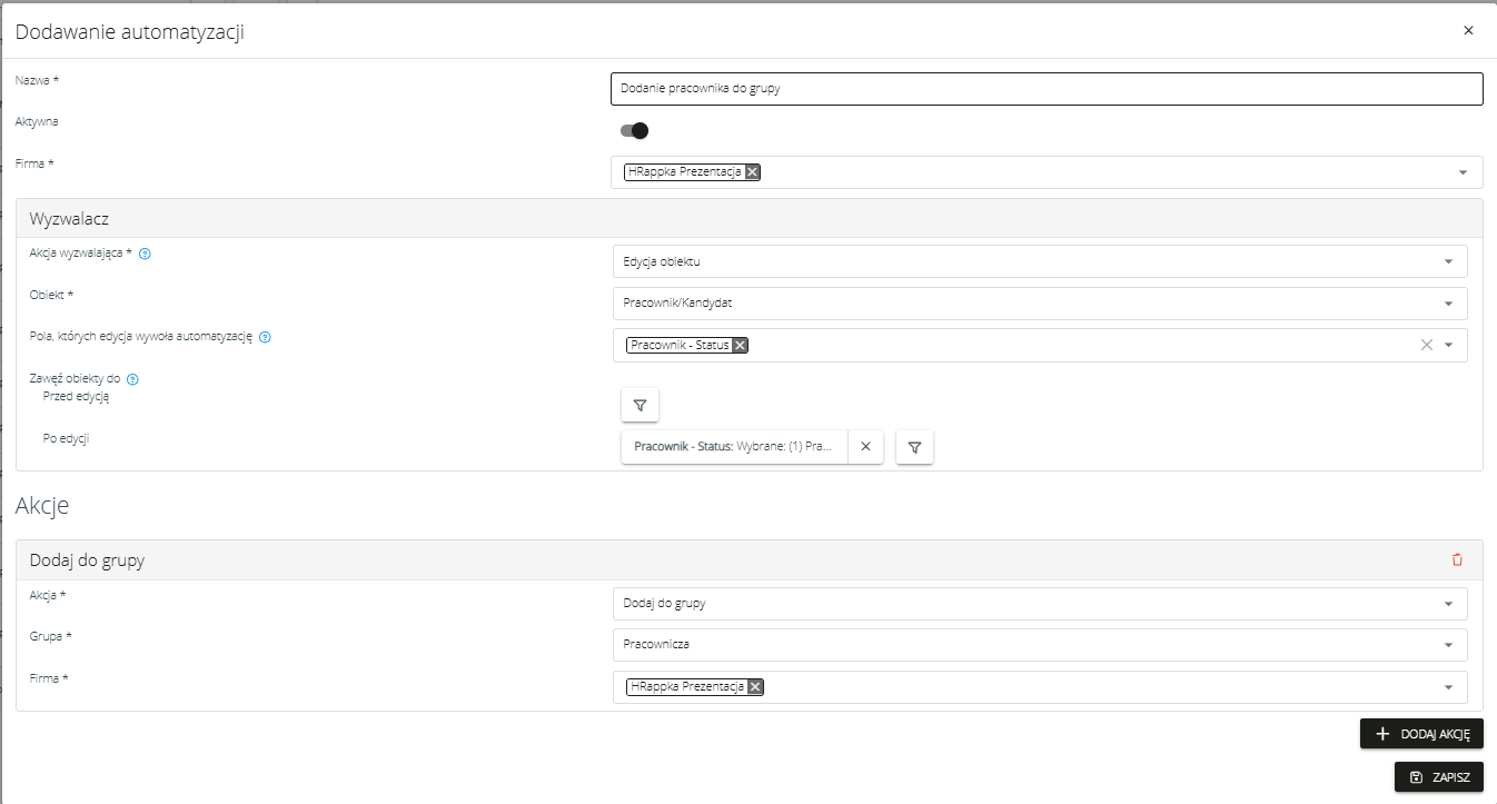 W module automatyzacji została dodana nowa akcja „Dodaj do grupy”, dostępna podczas edycji obiektu Pracownik/Kandydat. Funkcja ta pozwala na automatyczne przypisywanie encji do wybranej grupy, co ułatwia zarządzanie strukturą i organizacją danych w systemie.