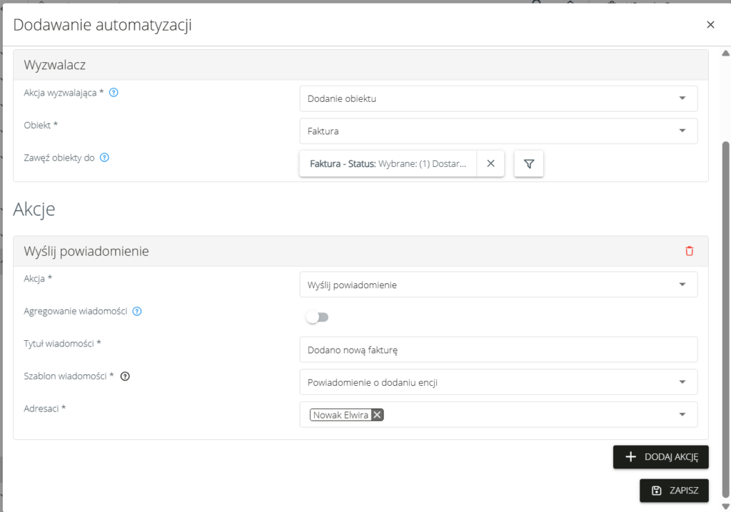 Przykładowo, po dodaniu faktury w statusie „Dostarczona – do weryfikacji”, system automatycznie wyśle powiadomienie do wskazanych odbiorców zgodnie z ustawioną automatyzacją.