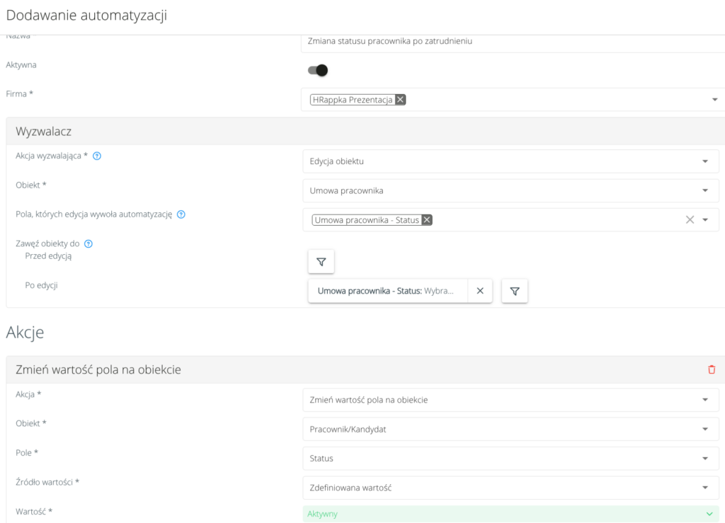 Zmiana statusu Pracownika po rozpoczęciu/zakończeniu umowy – przeniesienie konfiguracji do modułu Automatyzacje #