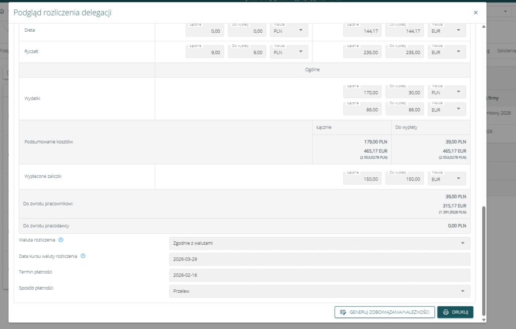 .{%Delegacja – Do zapłaty/zwrotu pracodawcy w PLN%}