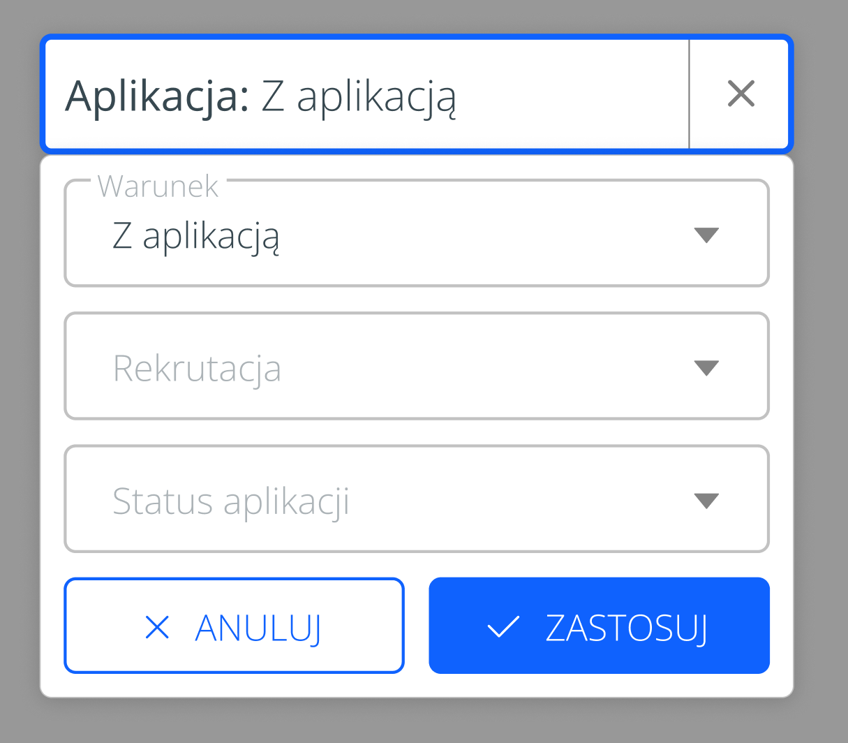 Dodatkowo filtrowanie można zawęzić do wybranej rekrutacji oraz określonego statusu aplikacji, co ułatwia szybkie i precyzyjne wyszukiwanie.
