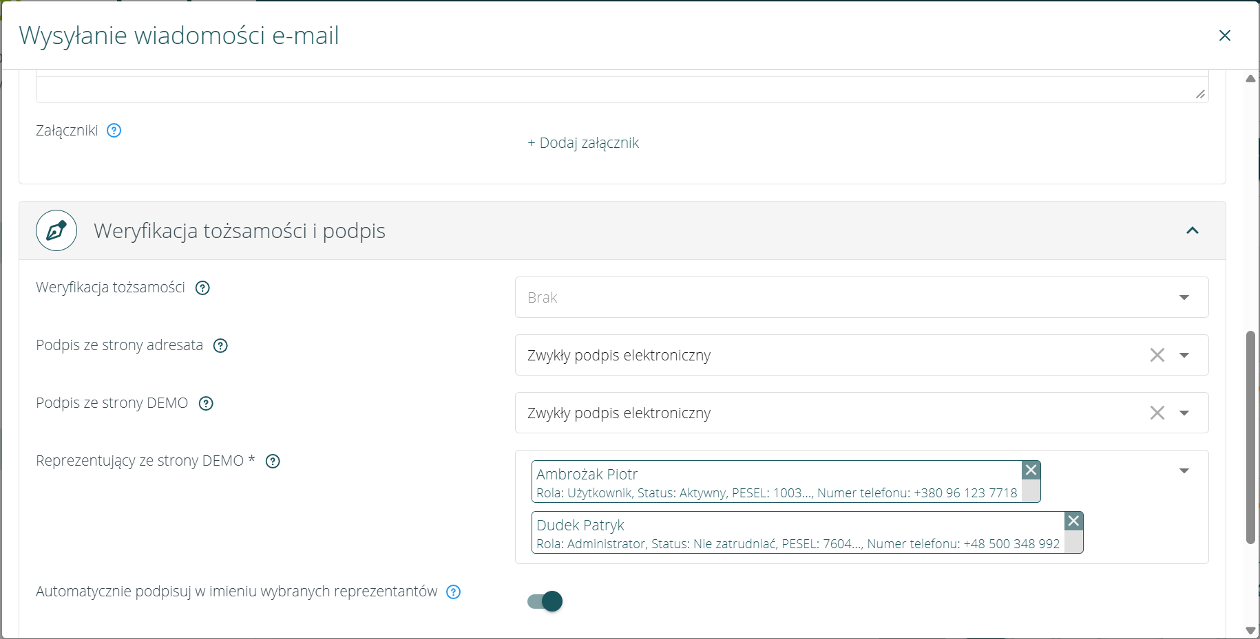 W Ustawienia → Załączniki → Ogólne → Weryfikacja tożsamości i podpis elektroniczny została dodana opcja „Automatycznie podpisuj w imieniu wybranych reprezentantów”. Po jej aktywowaniu suwak dla tego pola będzie automatycznie zaznaczony w oknie wysyłki co oznacza, że dokument po stronie wybranych reprezentantów zostanie automatycznie podpisany.