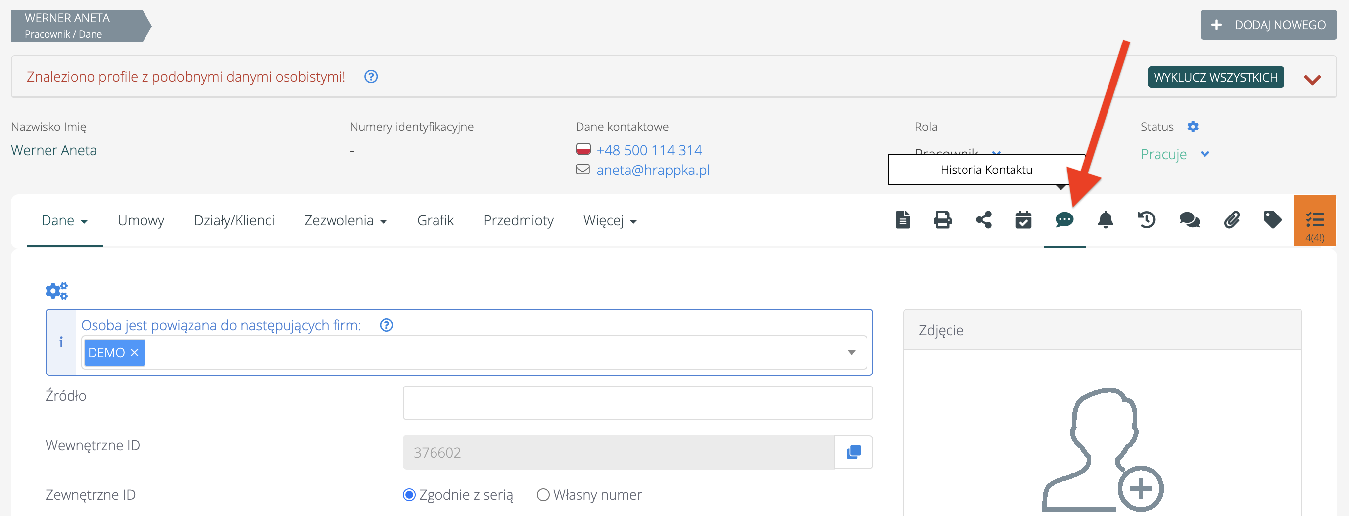 Po wejściu w historię kontaktu widoczna jest lista zarejestrowanych kontaktów np. z pracownikiem:
