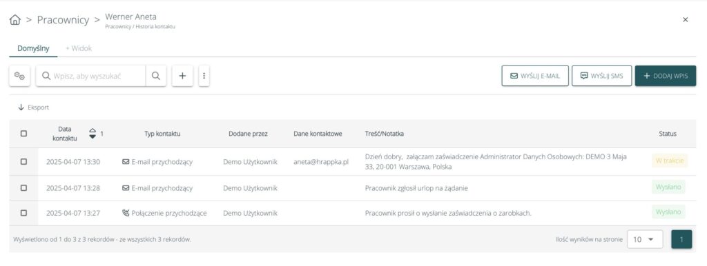 Z tego miejsca można wysłać maila/SMSa lub po prostu dodać informację o kontakcie, która pozwoli zachować ciągłość komunikacji z pracownikiem, kandydatem lub klientem.