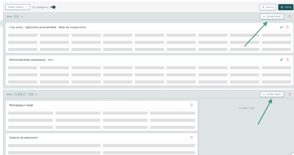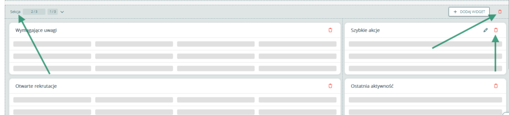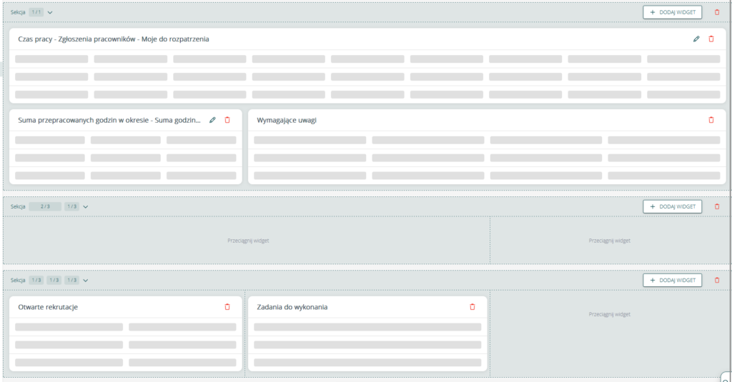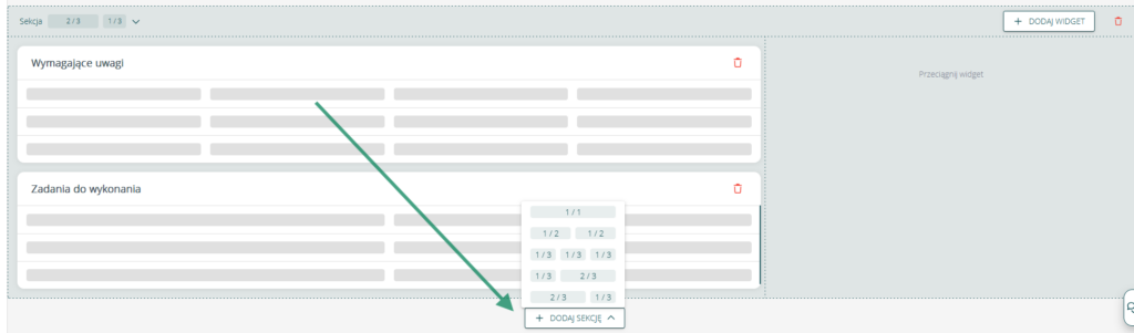 Po wskazaniu układu do powstałej sekcji można przeciągać dostępne widgety lub tworzyć nowe (przycisk dodaj widget w prawym górnym rogu sekcji). Jeśli wskazany układ zawiera więcej niż jedną kolumnę to możliwa jest także zmiana kolejności wyświetlanych widgetów. W tym celu należy najechać kursorem na obszar danego widgetu, kliknąć lewy przycisk myszki i trzymając wciśnięty przesunąć w widget w wybrane miejsce.