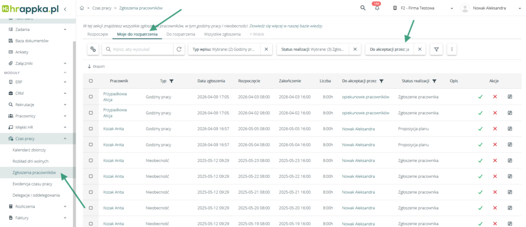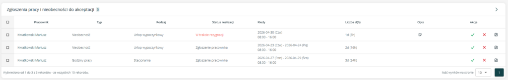 Zgłoszenia pracy i nieobecności do akceptacji #
