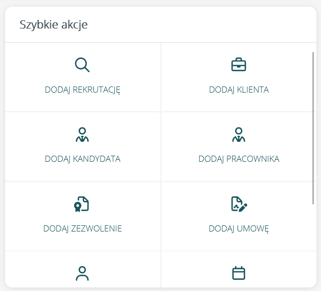 Widget składa się z przycisków odpowiadający często wykonywanym w systemie akcjom takim jak dodawanie Pracowników, rekrutacji, planowanie pracy czy wysyłka ankiet. Zawartość widgetu jest konfigurowalna oraz zależna od włączonych modułów i uprawnień zalogowanej osoby. Jeżeli zalogowany użytkownik nie posiada uprawnień do żadnej z akcji dostępnych w widgecie to nie zostanie on wyświetlony.