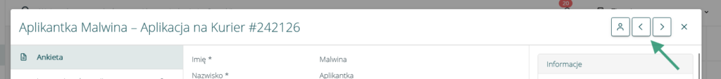 Aby przechodzić po aplikacjach należy użyć strzałek w prawym górnym rogu okna. Ikona użytkownika umożliwia przejście do profilu kandydata.