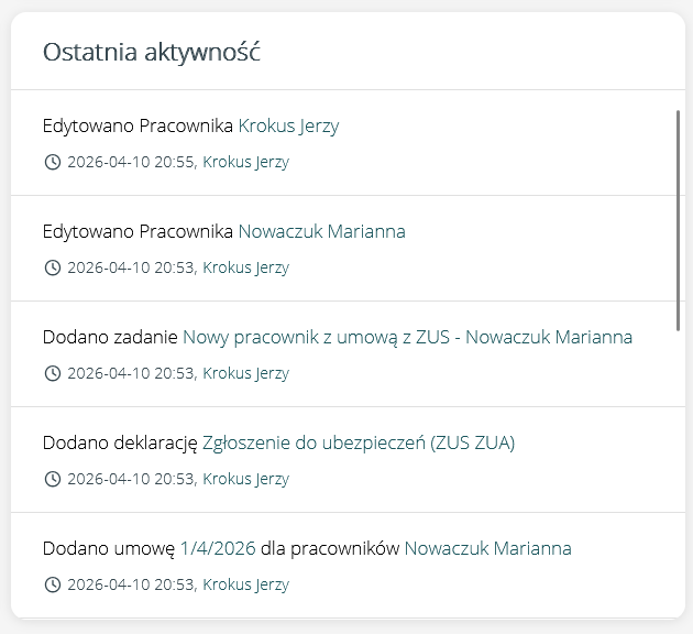 Analogicznie jak w poprzedniej wersji dashboardu widget prezentuje ostatnio wykonywane w systemie czynności. Jeżeli zalogowana osoba posiada rolę administratora to w widgecie widoczne będą akcje wykonywane przez wszystkie osoby korzystające z systemu. Jeśli natomiast zalogowana osoba posiada rolę użytkownika to zobaczy jedynie czynności które sama wykonywała. Zakres danych tego widgetu zawiera 25 wpisów z ostatnich 2 tygodni. Widget ten jest niezależny od włączonych modułów ani uprawnień użytkownika.