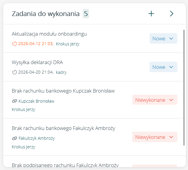 Widget ten podobnie jak powyższy jest odzwierciedleniem widgetu “Zadania” dostępnego w poprzedniej wersji dashboardu i prezentuje zadania w statusie innym niż Wykonane, przypisane do zalogowanej osoby. Z poziomu widgetu możliwe jest: