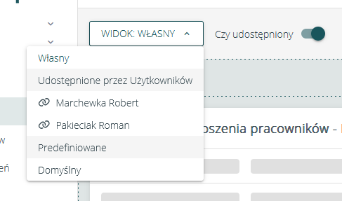 Widoki innych użytkowników to widoki własne, na których ich autorzy włączyli opcję “czy udostępniony”. Dzięki temu osoby na podobnych stanowiskach w Firmie (pracujące na tych samych modułach, raportach etc) mogą korzystać z tego samego widoku utworzonego przez jedną z tych osób i nie muszą tworzyć widoków własnych.